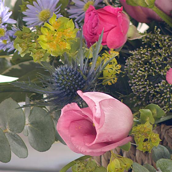 A fragrant country basket arrangement, that looks like you have just picked the roses, lisianthus and asters yourself from the garden.