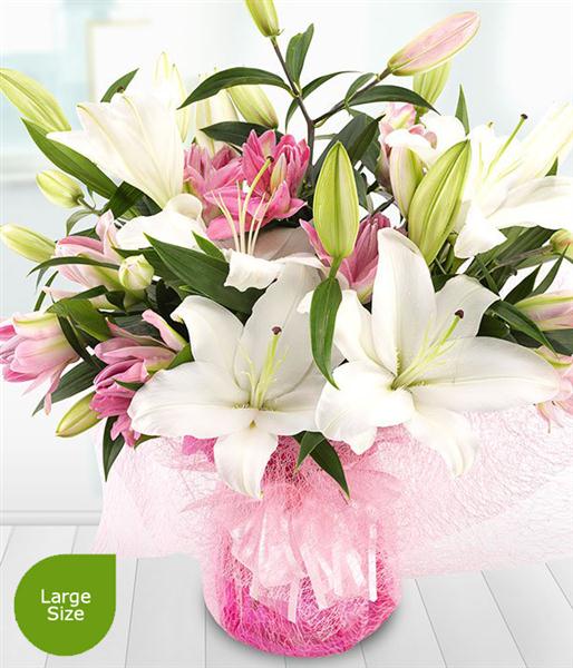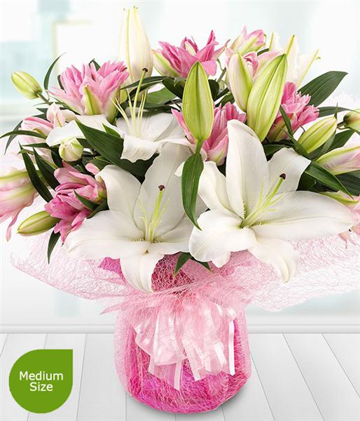 A timeless classic. White and pink Lilies in an aqua pack bouquet, ready to display.