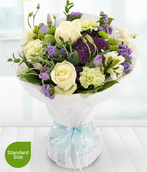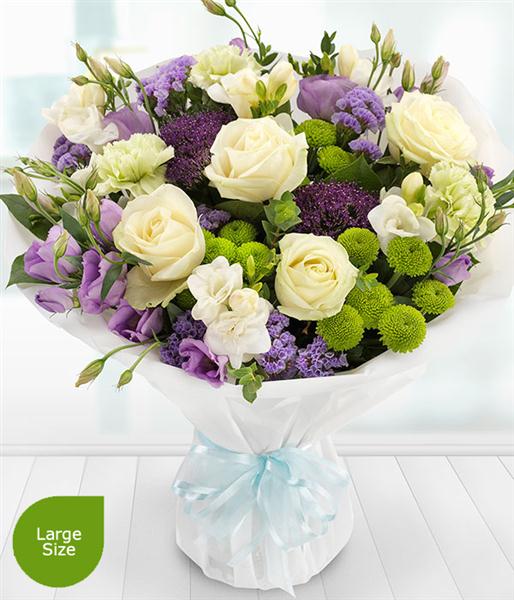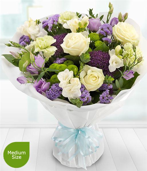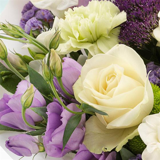A delicate and fragrant mix of white Roses and Freesias with lilac Lisianthus and Trachelium, coupled with lavender Statis, green Spray Chrysanthemums and Carnations.