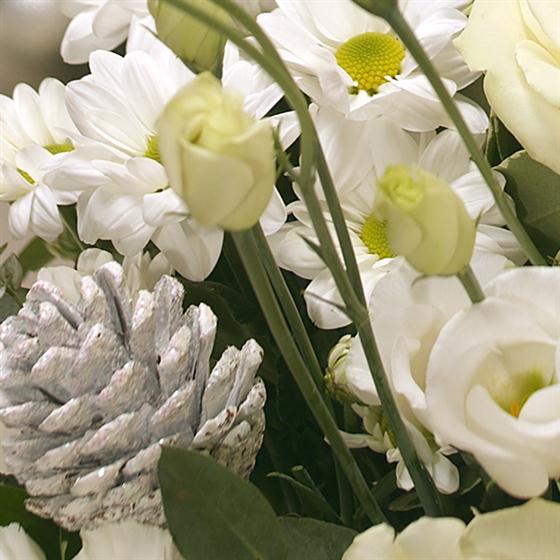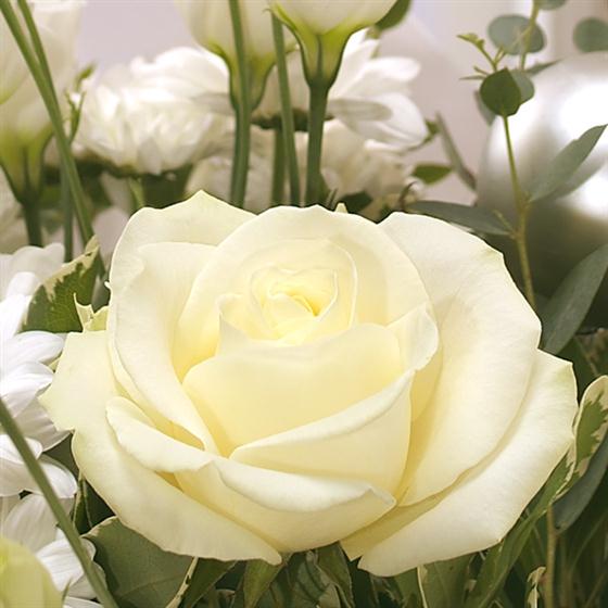 Crisp, cool creams and whites in the form of Roses, Lisianthus and Carnations, combined with Eucalyptus and Ruscus create a beautiful snowy white aqua pack bouquet.