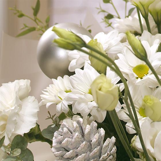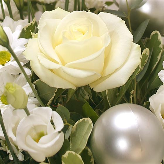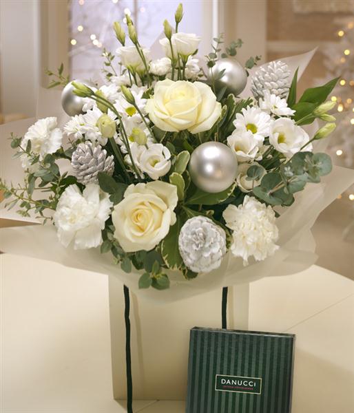 Crisp, cool creams and whites in the form of Roses, Lisianthus and Carnations, combined with Eucalyptus and Ruscus create a beautiful snowy white aqua pack gift bag bouquet. Includes a delicious box of mixed chocolates