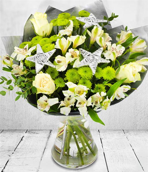 Gorgeous white roses, white alstroemeria and green chrysanthemums nestled with silver stars for that perfect festive feel.