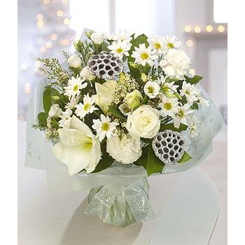A stunning, classic, crisp white aquapack of white Amaryllis, Roses, Carnations, Chrysanthemums and Wax Flowers. A wonderful Christmas flower gift that will look magnificent in any setting.