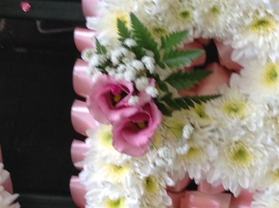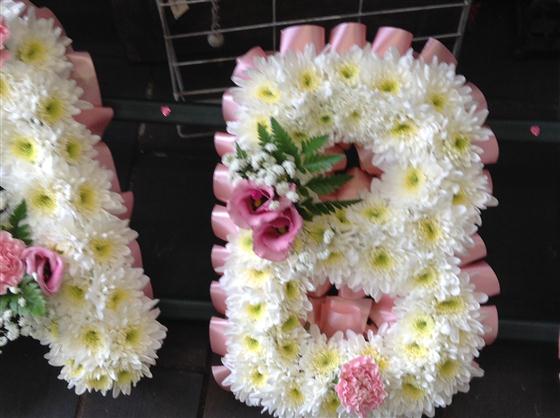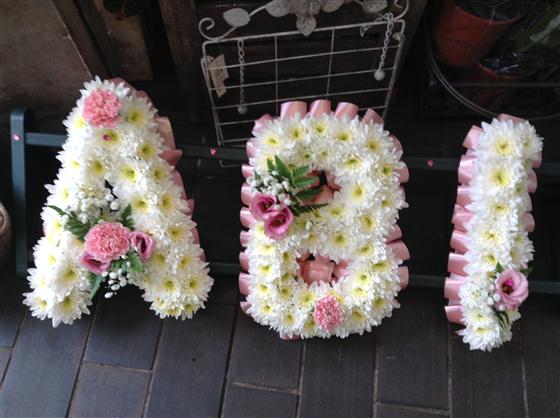 Your child's name in flowers. Here is an example of a child's tribute. Of course, any name made to order. The price here is for 3 letters. Please call the shop for your special name.
